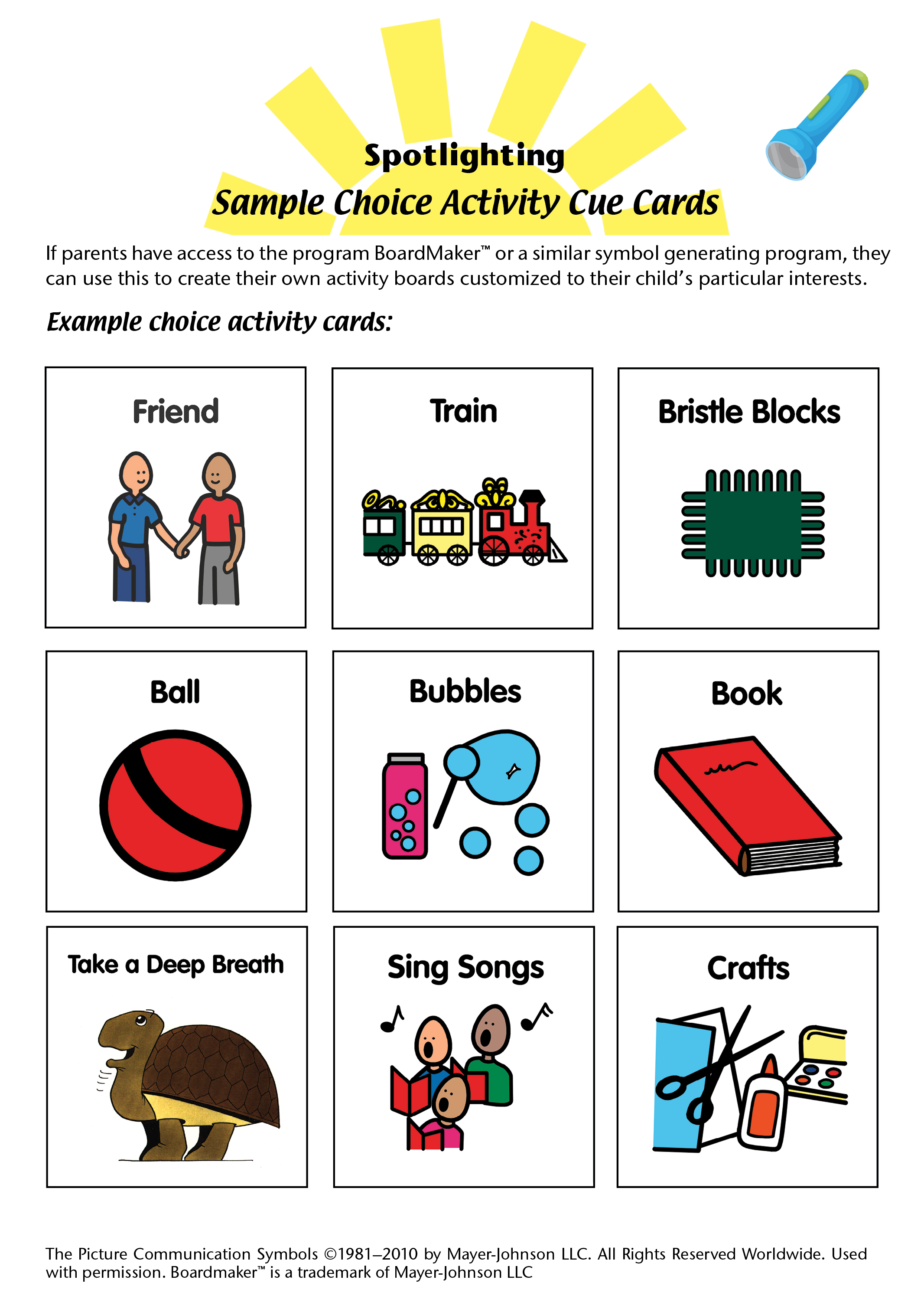 • Use the visuals to cue or prompt a child to understand an adult’s request, make a request, indicate a choice, understand what will happen next and what to do, try a self-regulation strategy, or practice a targeted social interaction